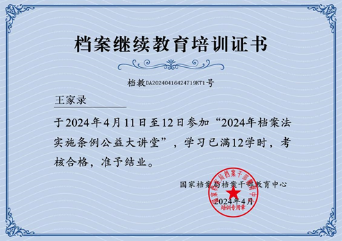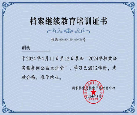 档案馆工作人员档案继续教育培训证书