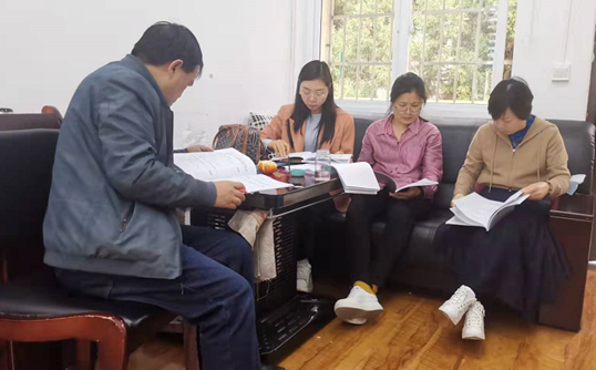 姜萍(右一)对档案馆工作人员进行业务指导